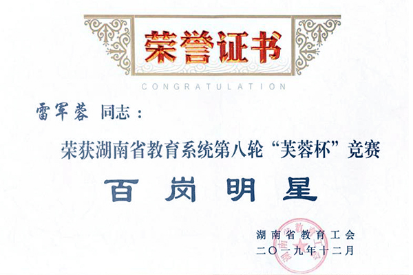 一直以来,公司高度重视工会和女工工作,大力推动“女性力量”,弘扬“女职风采”。雷军蓉教授作为第八轮“芙蓉杯”竞赛活动先进典型,充分展现女性教职工在推动学院建设、推进社会公德、职业道德、家庭美德、个人品德建设中的时代风采,发扬了爱岗敬业、求真务实、敢为人先、诲人不倦的优良传统。