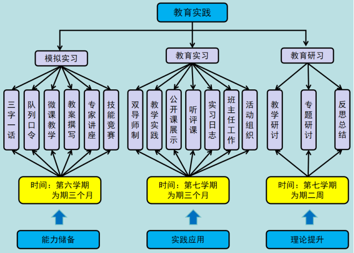 严格过程管理,打造高标准教育实践模式。建有稳定的教育实践基地,严把教育实践过程关,从前期准备到岗位实践,构建了层层推进与高质量把关的“三习”模式。学院教育实践分为三个阶段:模拟实习(含教育见习)、教育实习和教育研习。模拟实习内容包括:三字一话、常用口令、队列队形、课间操练习、PPT制作与说课、教案与教学设计的撰写、片段式教学与微课教学,以及师范技能测试、专家讲座等。模拟实习结束后会进行技能展示大会,检验实践成效。教育实习期间实行双导师制,对每个实习生的教案、听评课、实习日志、教学笔记、公开课展示等均有具体明确的要求。教育实习结束后学院统一召开教育实践总结大会,各实习队汇报模拟实习、教育实习和教育研习中所进行的教学活动、班级管理、课外体育活动组织、训练竞赛等工作成果,展示各队的组织管理、队刊、教案、实习日志等材料,大会聘请专家对各实习队成果进行点评。多年来,学院员工教育实践受到学校领导与实习学校的高度评价。