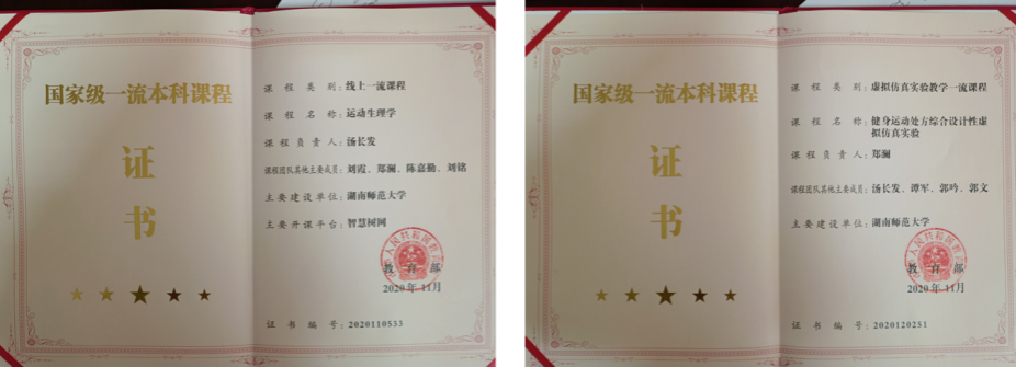 依托高质量课程建设,推动“学、练、赛、评”一体化发展。2020-2022年期间学院建设了5门国家级、省级一流课程,其中《健身运动处方综合设计性虚拟仿真实验》与《运动生理学》获批国家级一流本科课程。2018-2023年间学院获批立项国家级精品在线开放课程1项,省级精品课程4项;通过中外合作办学引进英国中央兰开夏大学优质课程25门。积极探索术科课程教学改革,形成了较为成熟的“以赛促练,以赛代考”教学与考核模式。学院每年组织的员工“篮球比赛”“足球比赛”“排球比赛”“广播体操比赛”“武术基本功大赛”“乒乓球比赛”“羽毛球比赛”等,贯穿了术科课程教学与考核的全过程,实现了专业技能提升与职业岗位实践的相互促进。大学公共体育课程改革形成了以传承民族经典文化与助力锻炼习惯养成为特色的教学内容与考核体系。设置了以太极拳为特色的全员必修内容,制定了课外奖励性加分考核制度,以助力员工积极参与课外体育活动与锻炼习惯养成。《大学体育(二)》获批省级一流课程。